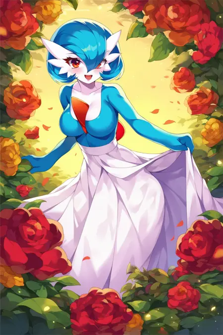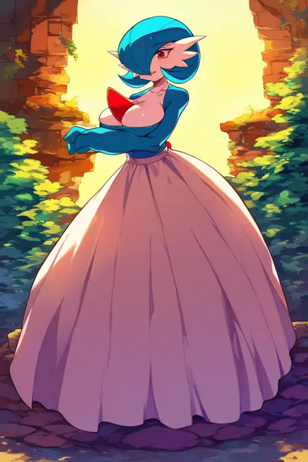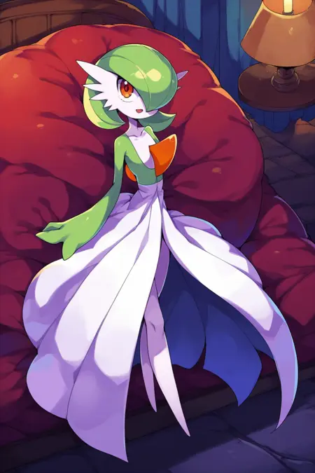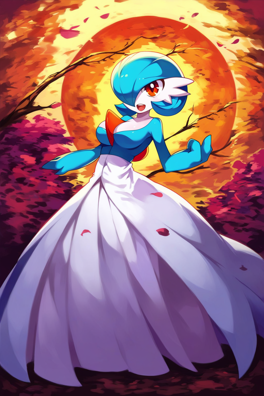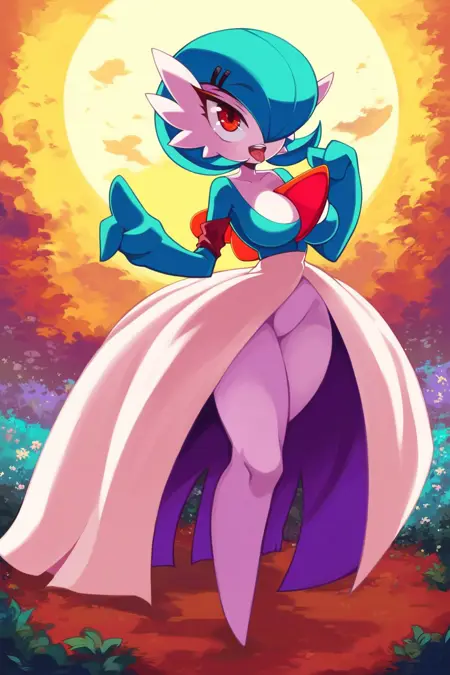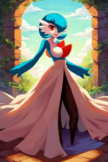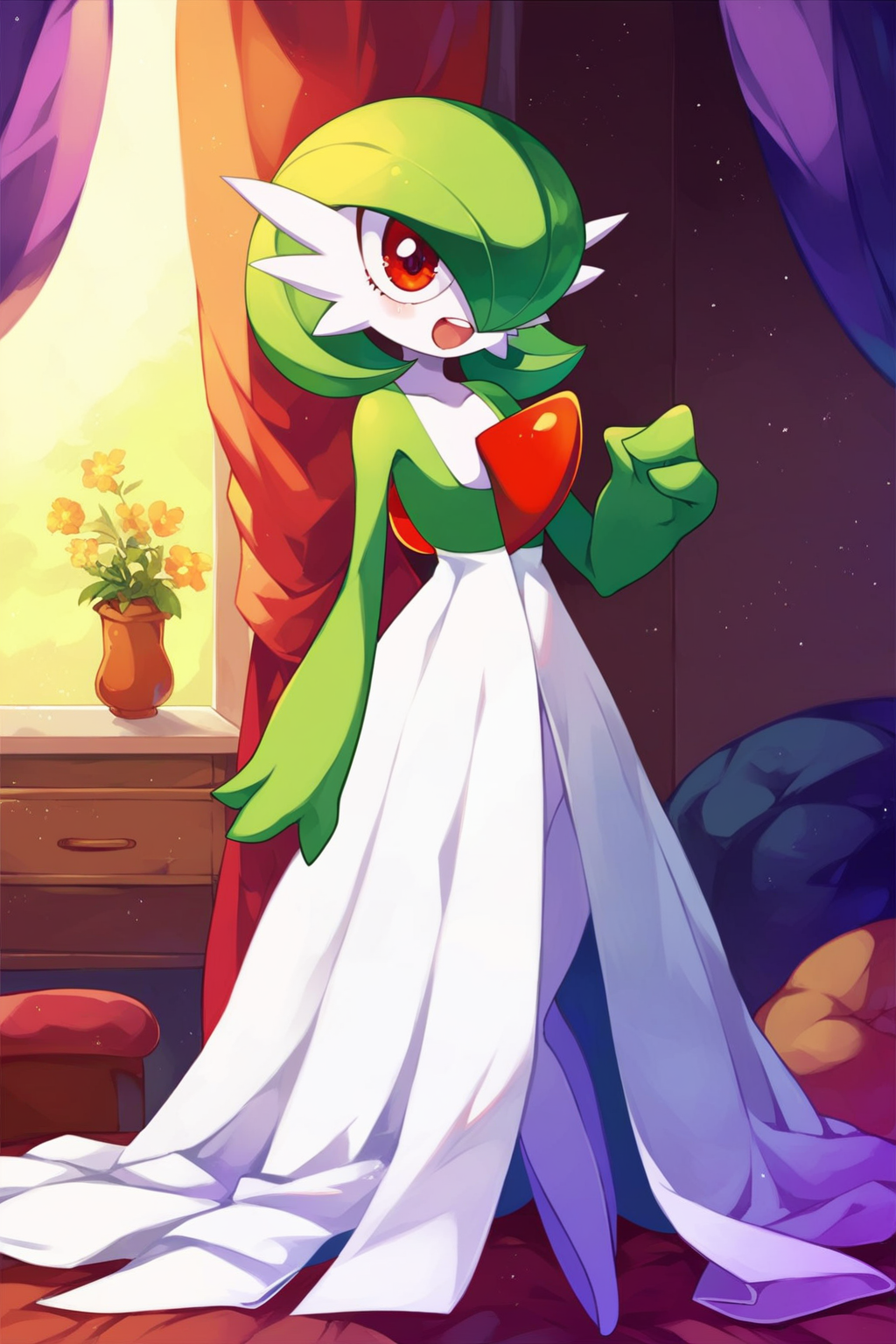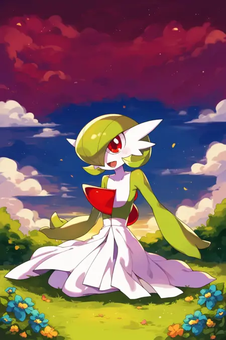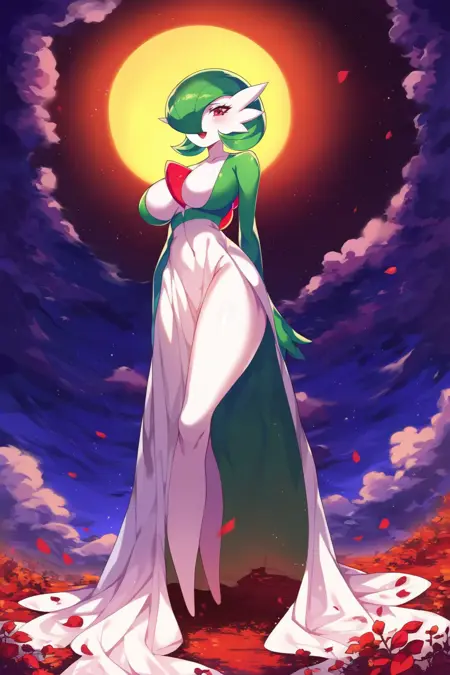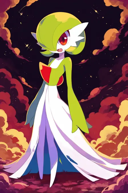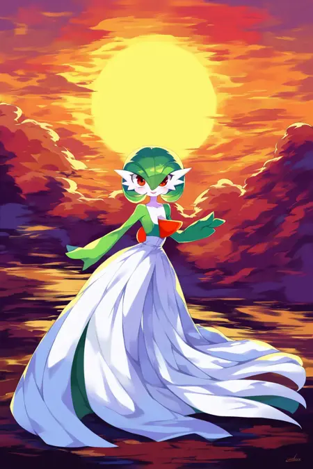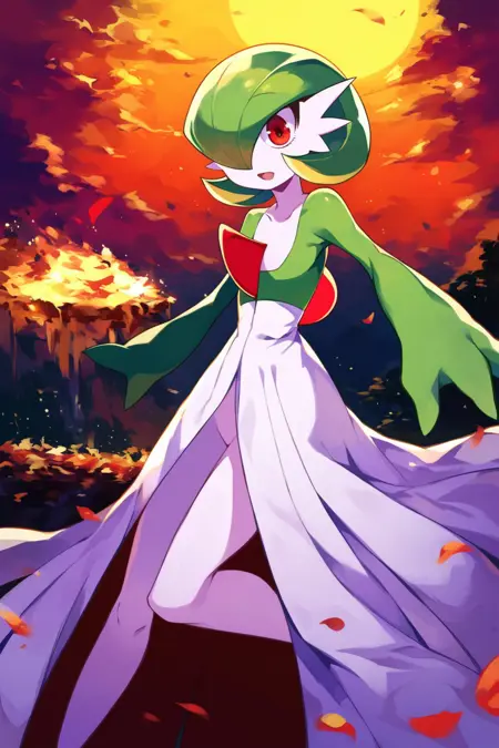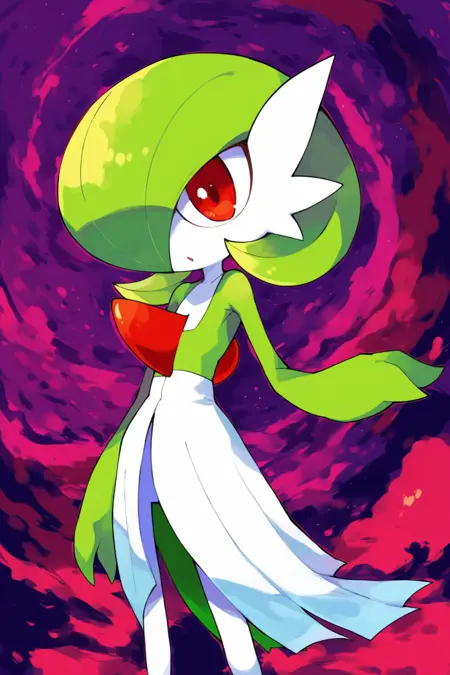 프롬프트: 가르데바이어, 흰 피부, 짧은 머리, 붉은 눈, 흰 드레스, 포켓몬(생물), 가슴에 붉은 문양, 녹색 소매, 반짝임,