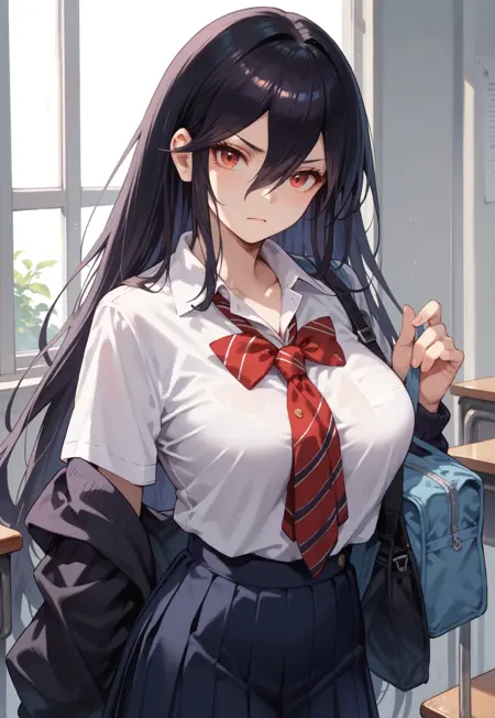 Leviacaptain, large breasts, red eyes, black hair, long hair, hair between eyes, yellow hair_ribbon, black hairband, red short_horns, gym uniform, white shirt, short sleeves, red buruma, black sneakers,