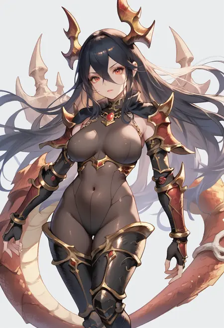 Leviadef, large breasts, red eyes, black hair, long hair, hair between eyes, dragon_horns, chained_neck, chain_accessory, black bodystocking, skin tight, dragonic_gauntlets, jewel_bracelet, dragonic_armored_long_boots,