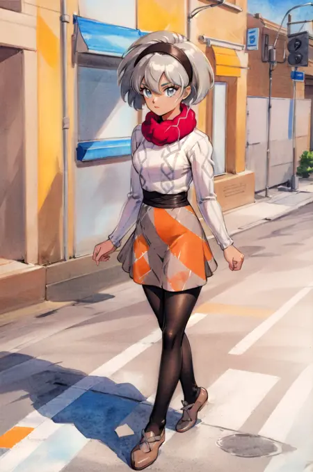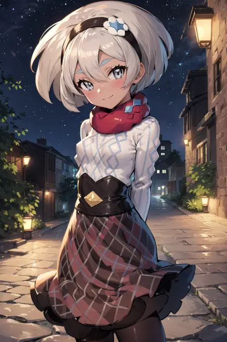 情人节装扮 - bea (pokemon), 替换服装, 黑色发带, 发饰, 红色围巾, 白色毛衣, 棕色连衣裙, 黑色连裤袜 - 若在负向提示中加入 bow hairband 效果更佳。如果出现只有发带但没有花的情况,可尝试提高 hair ornament 的权重,或直接添加 flower。