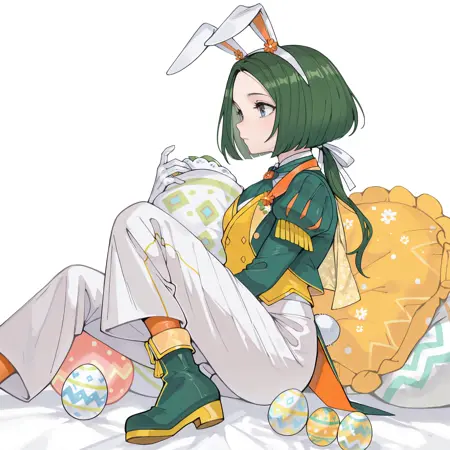 봄 린하르트(Fire Emblem Heroes): linhardtSpring, 볼브 헤어컷, 로우 페니테일, 헤어 리본, 토끼 귀 허수, 토끼 꼬리 허수, 녹색 테일코트, 노란색 케플릿, 노란색 베스트, 녹색 애스콧, 흰 장갑, 꽃, 흰색 바지, 주황색 레깅스, 녹색 부츠