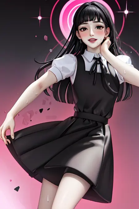 white shirt, neckbow, overalls, black skirt