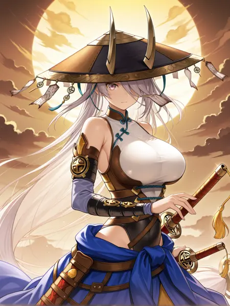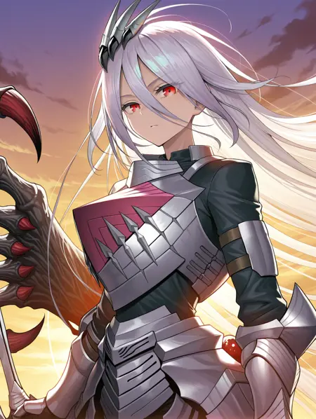 タグ(衣装1):青い髪リボン、青い髪止め、黒いフルボディスーツ、銀色の髪飾り、白いカーテン、銀色の鎧、銀色の胸板、銀色の肩甲、銀色の鎧の手袋、白い腰のカーテン、銀色の鎧のブーツ