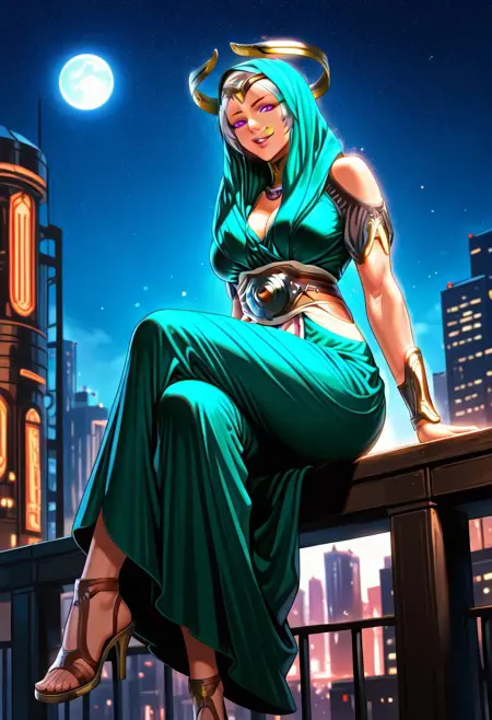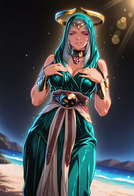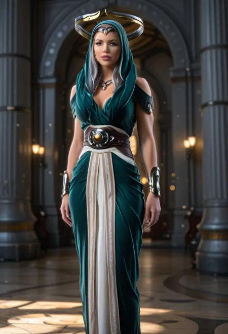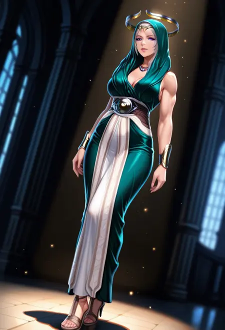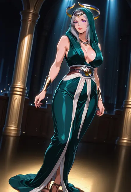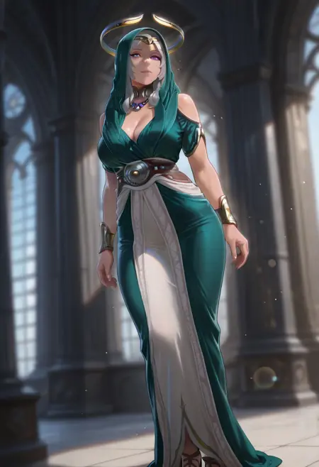 HeridaSF, 1girl, 솔로, 성숙한 여성, 여신, 황금색 님버스, 화관, 녹색 후드, 후드 올린, 회색 머리카락, 관모, 보라색 눈, 코, 두툼한 입술, 메이크업, 목걸이, 큰 가슴, 보석, 젖가슴 노출, 후드가 달린 긴 드레스, 녹색 드레스, 어깨 노출, 벨트, 등이 드러난 드레스, 팔보호대, 샌들, 하이힐,