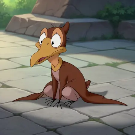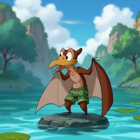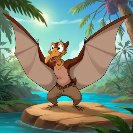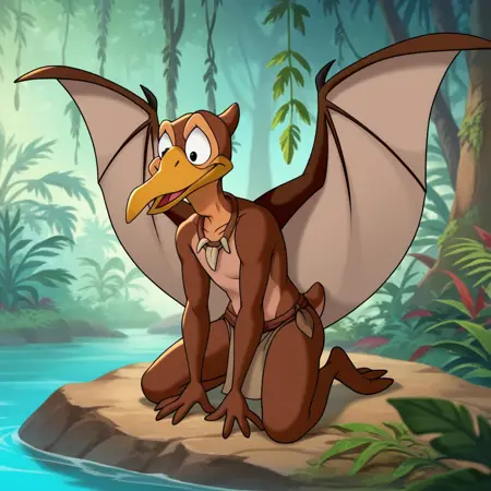 Petrielbt, feral, male, Pteranodon, brown skin, orange beak, black eyes, membranous wings, winged arms, 3 fingers, 3 toes, young feral
