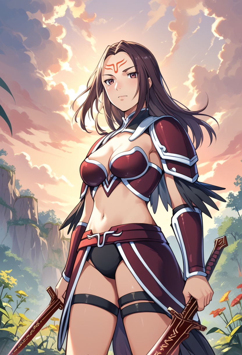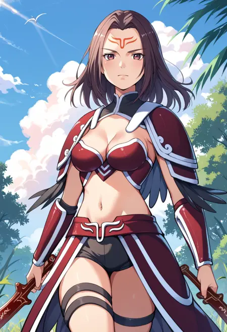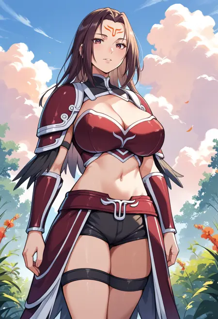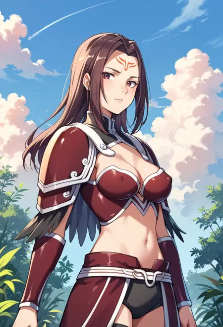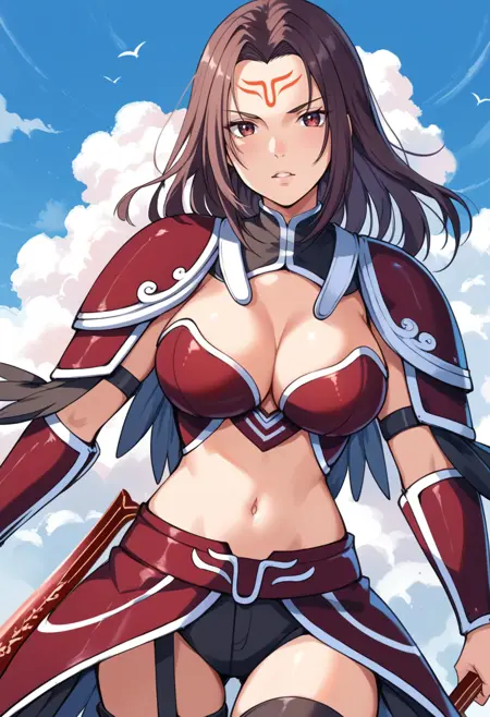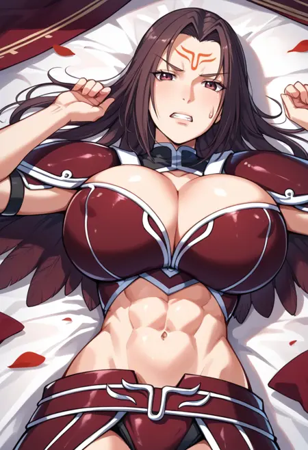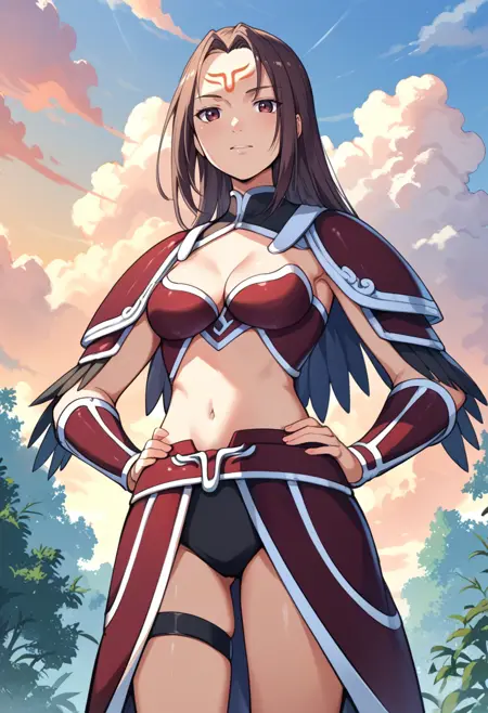 タグ(衣装):赤いビキニアーマー、赤い肩アーマー、赤いファウルズ、赤いヴァンブレイス、赤いアーマーブーツ、へそ、腹部