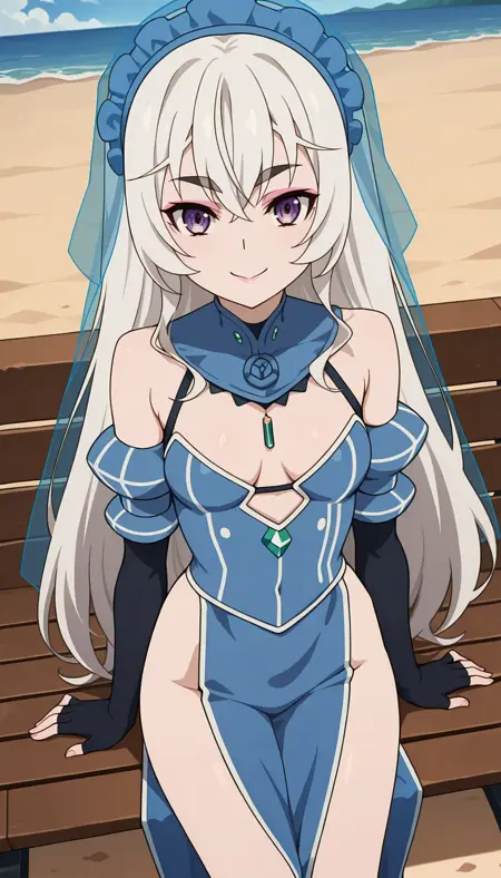 Outfit: blue maid headdress, veil, long dress, detached collar, detached sleeves, elbow gloves, fingerless gloves, pelvic curtain, bare legs, blue footwear