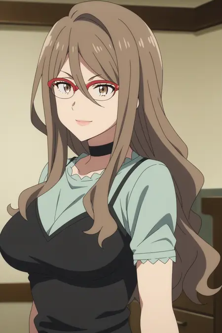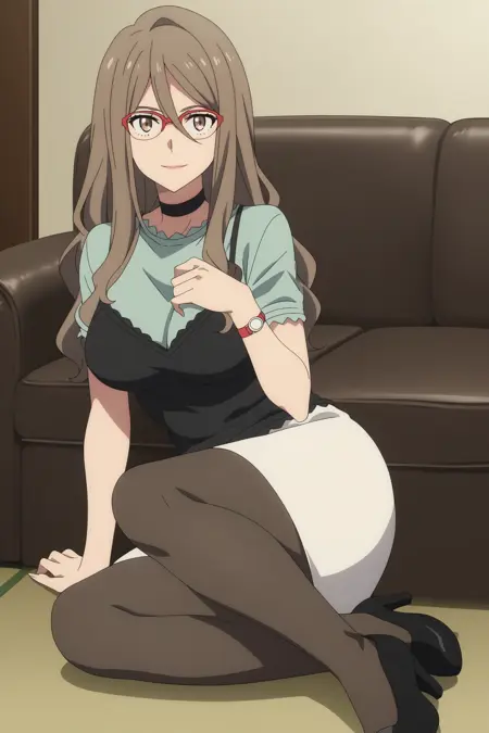 nakahara mizuki, brown hair, long hair, hair between eyes, sidelocks, red-framed eyewear, brown eyes, choker, green shirt, short sleeves, frilled sleeves end, black camisole, frilled camisole, wristwatch, grey skirt, pencil skirt, black pantyhose, black footwear, high heels