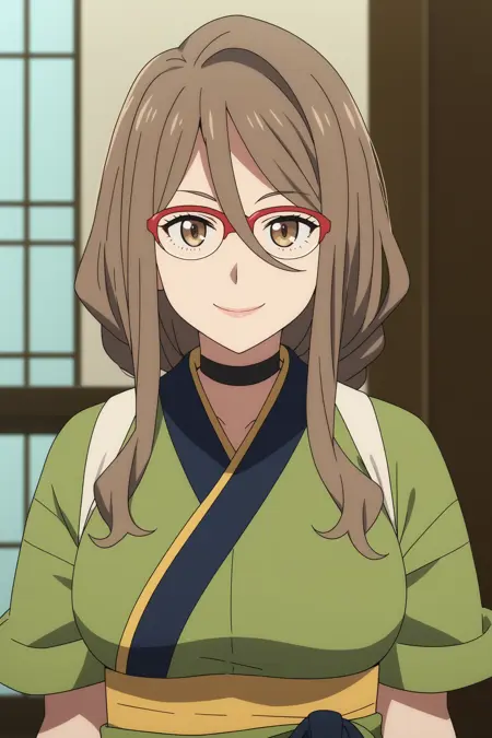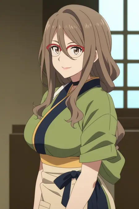 nakahara mizuki, brown hair, long hair, ponytail, hair tie, sidelocks, hair between eyes, red-framed eyewear, brown eyes, japanese clothes, kimono, choker, green uniform, blue collar, short sleeves, sleeves rolled up, apron, blue skirt, long skirt, tabi, flip-flops