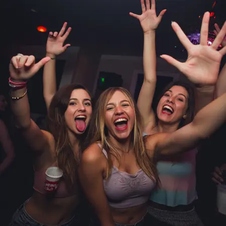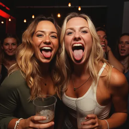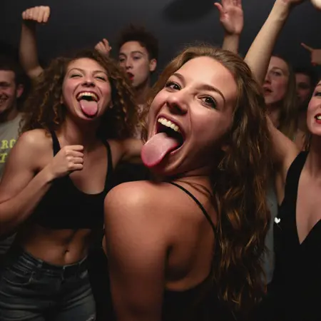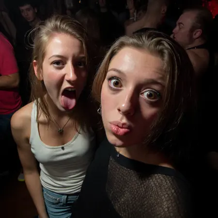 Trained up to 2000px sharp high quality crops on 600+ high resolution sharp images of partying girls looking at camera laughing, tongue out, wet t-shirt contest, pouring drinks, heads tilted, crazy faces, kissing, bare/nude bellies, hands in victory signs etc.