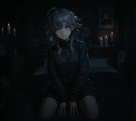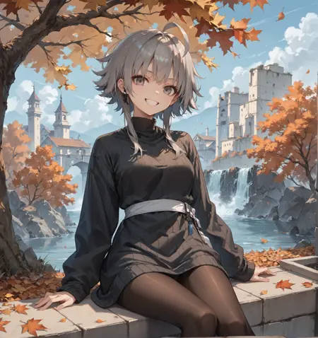 Mayer, grey hair, short hair with long locks, ahoge, grey eyes, tail,