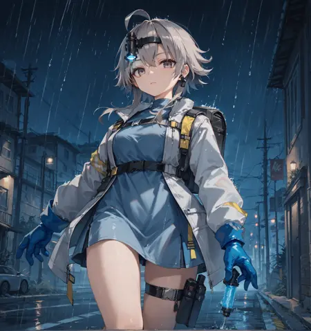 grey jacket, blue dress, rubber gloves, head flashlight, thigh strap, backpack, boots