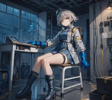 회색 재킷, 파란 드레스, 고무 장갑, 머리용 플래시, 허벅지 스트랩, 백팩, 부츠