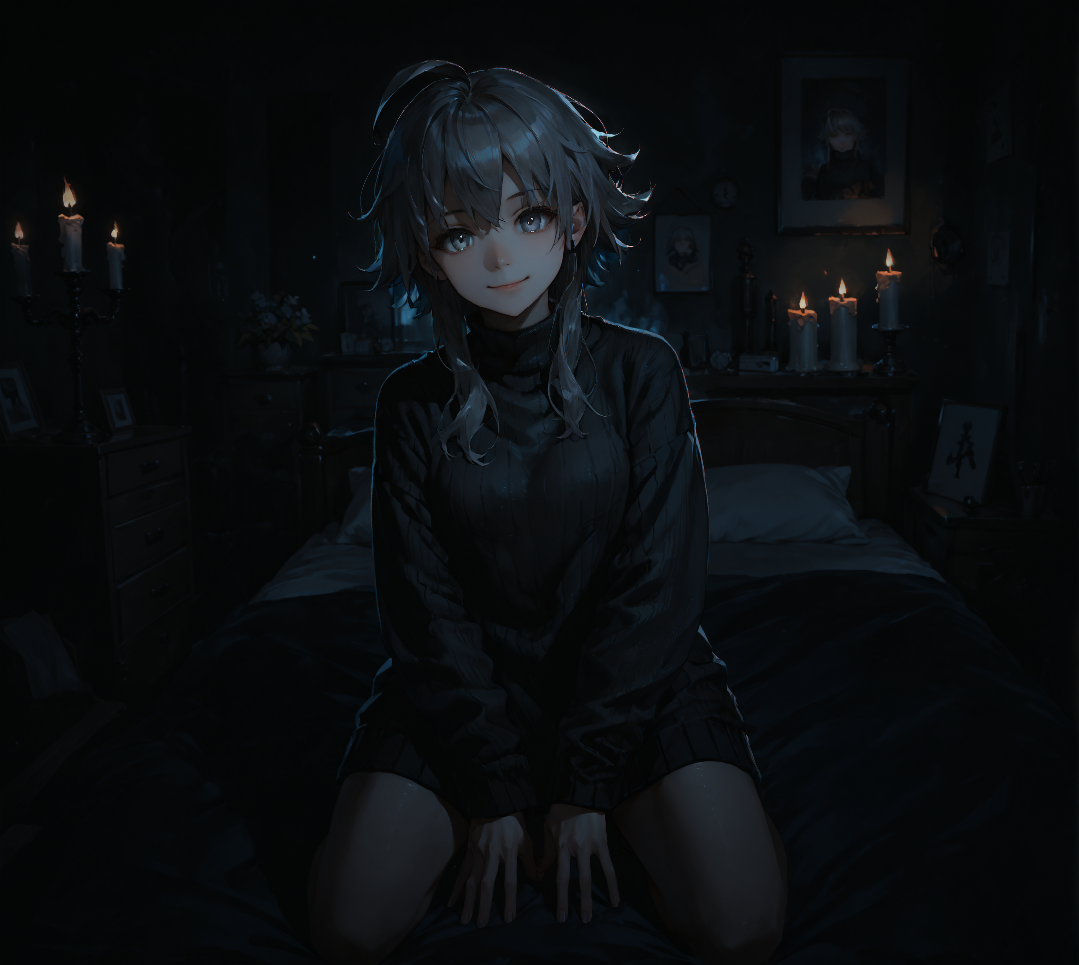 주황색 재킷, 검은 스웨터, 터틀넥, 스타킹, 검은 장갑, 팔밴드,