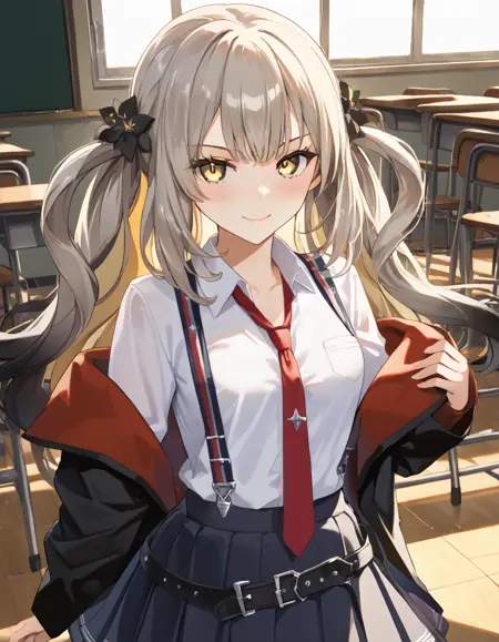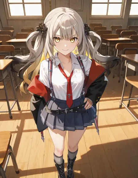 MarieSchool, scl necktie, scl belt, scl collared shirt, scl suspenders, scl hair ornament, scl skirt, scl boots, scl socks, short socks, grey socks, scl blazer, open blazer