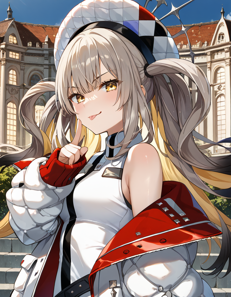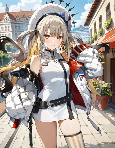 Marie1asc,1asc帽子,1asc夹克,白色夹克,敞开式夹克,露肩,袖子过腕,袖子过手指,1asc连衣裙,无袖,1asc腰带,1asc单只袜子,1asc单只罗纹大腿袜,不对称腿部穿搭,不均匀腿部穿搭,不匹配的腿部穿搭