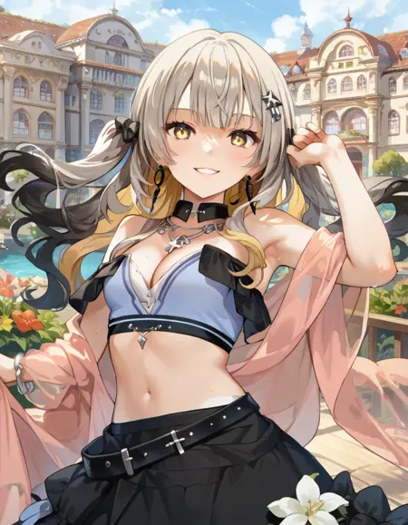 long hair, grey hair, blonde hair, gradient hair, black hair, two side up, yellow eyes