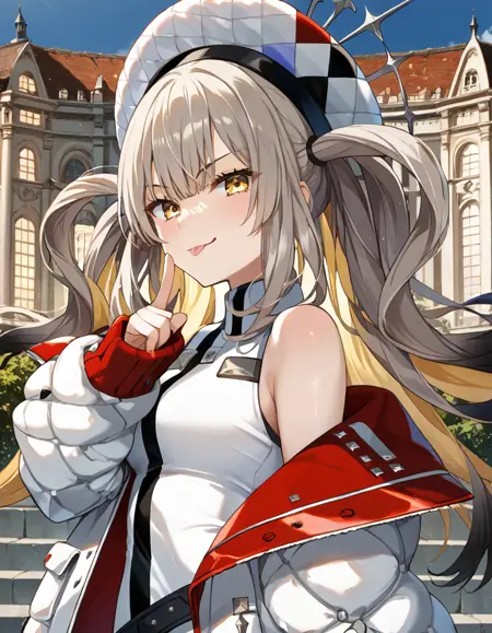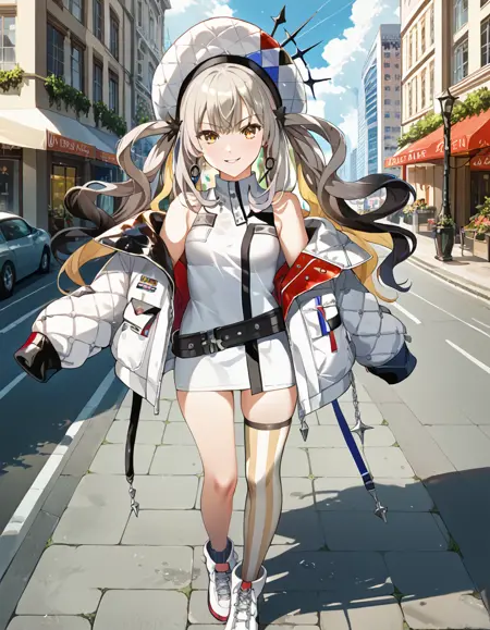Marie1asc, 1asc hat, 1asc jacket, white jacket, open jacket, off shoulder, sleeves past wrists, sleeves past fingers, 1asc dress, sleeveless, 1asc belt, 1asc single sock, 1asc single ribbed thighhigh,asymmetrical legwear, uneven legwear, mismatched legwear