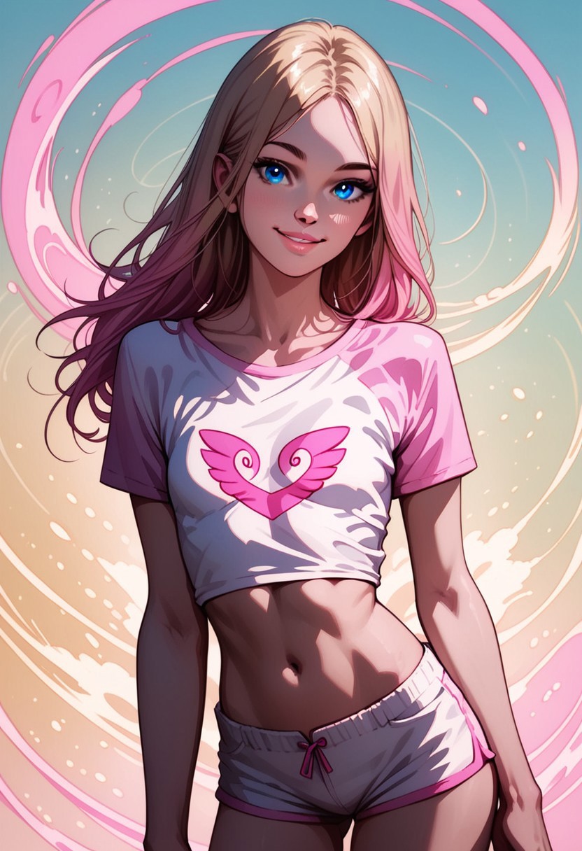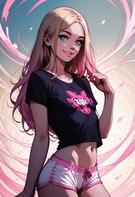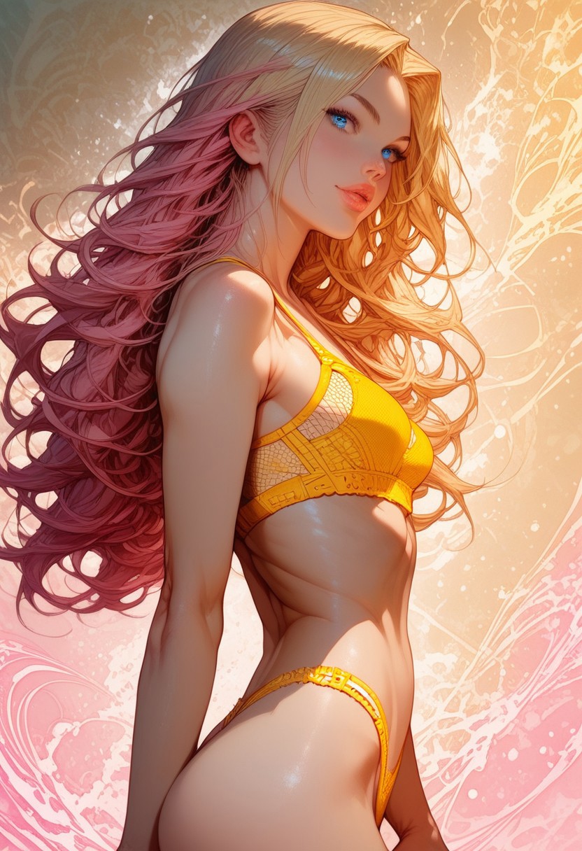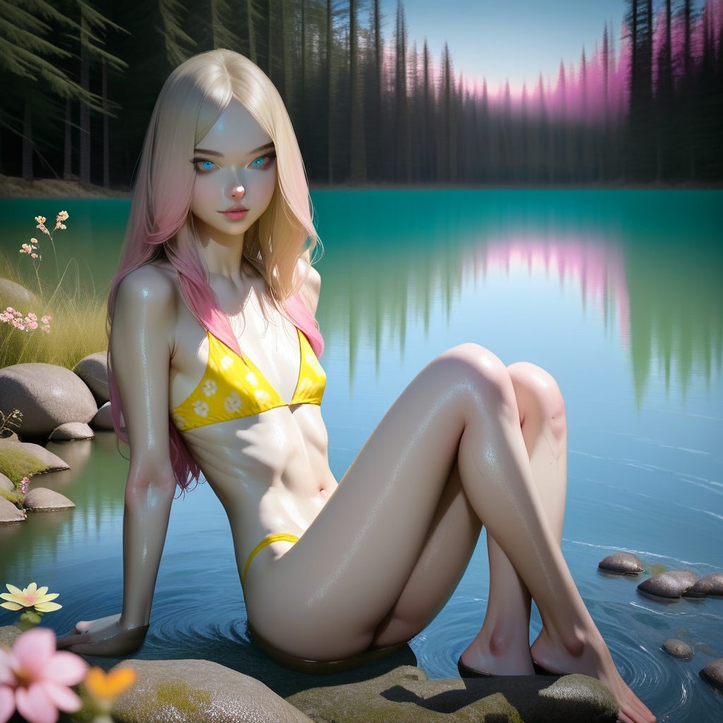 nordic girl, very pale skin, long blonde hair, gradient pink hair, parted bangs, blue eyes, slim, small breasts, almost flat chest, perfect ass