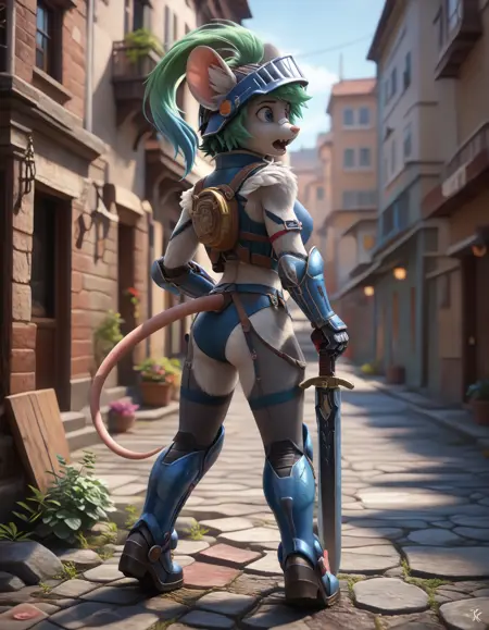 matilda, mouse, bandage on nose, bandage on nose, grey body, grey fur, fluffy fur, green hair, armor, helmet, weapon, sword, claws