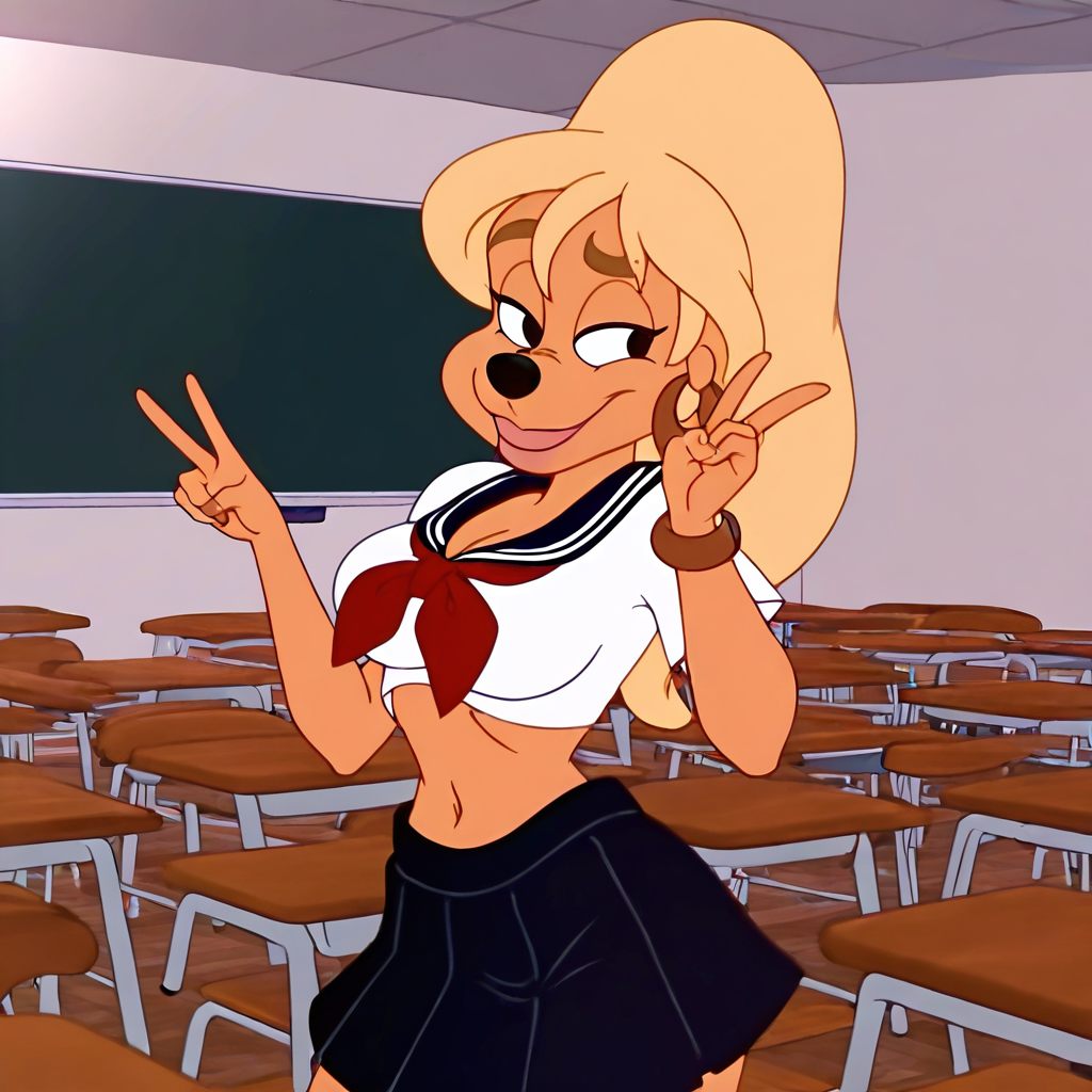 (A Goofy Movie)のリサ。マックスがほぼ告白したヴァレー・ガール。通常のLoRA強度:0.6–0.9、背景に重きを置く。ただし、'indoor'や'outdoor'のタグを使用する場合は非常に具体的に。映画のスタイルに合わせるには、'TVStyle'タグを使用してください。お楽しみください。