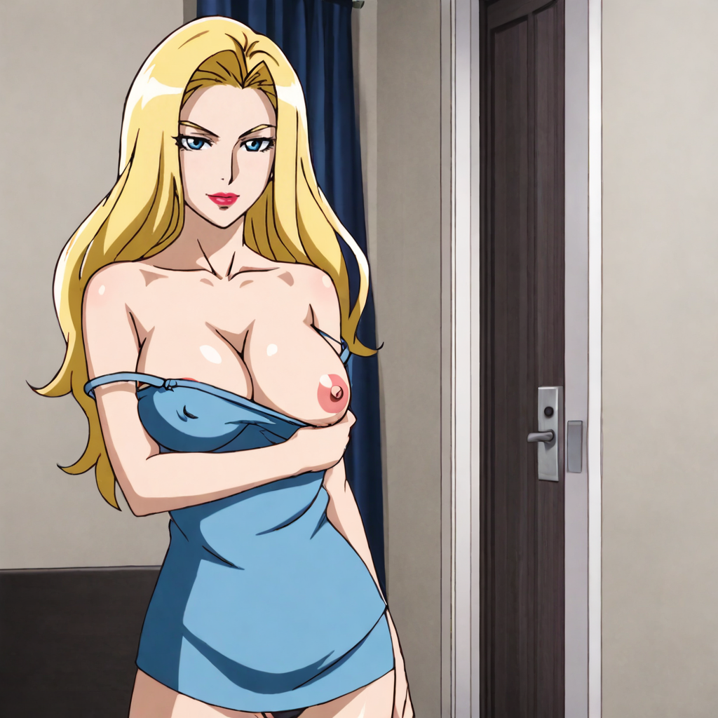 Trigger with dress: MissX, 1girl, solo, blonde hair, large breasts, pantyhose, long hair, cleavage, blue eyes, pencil skirt, jacket, makeup, lipstick, cowboy shot