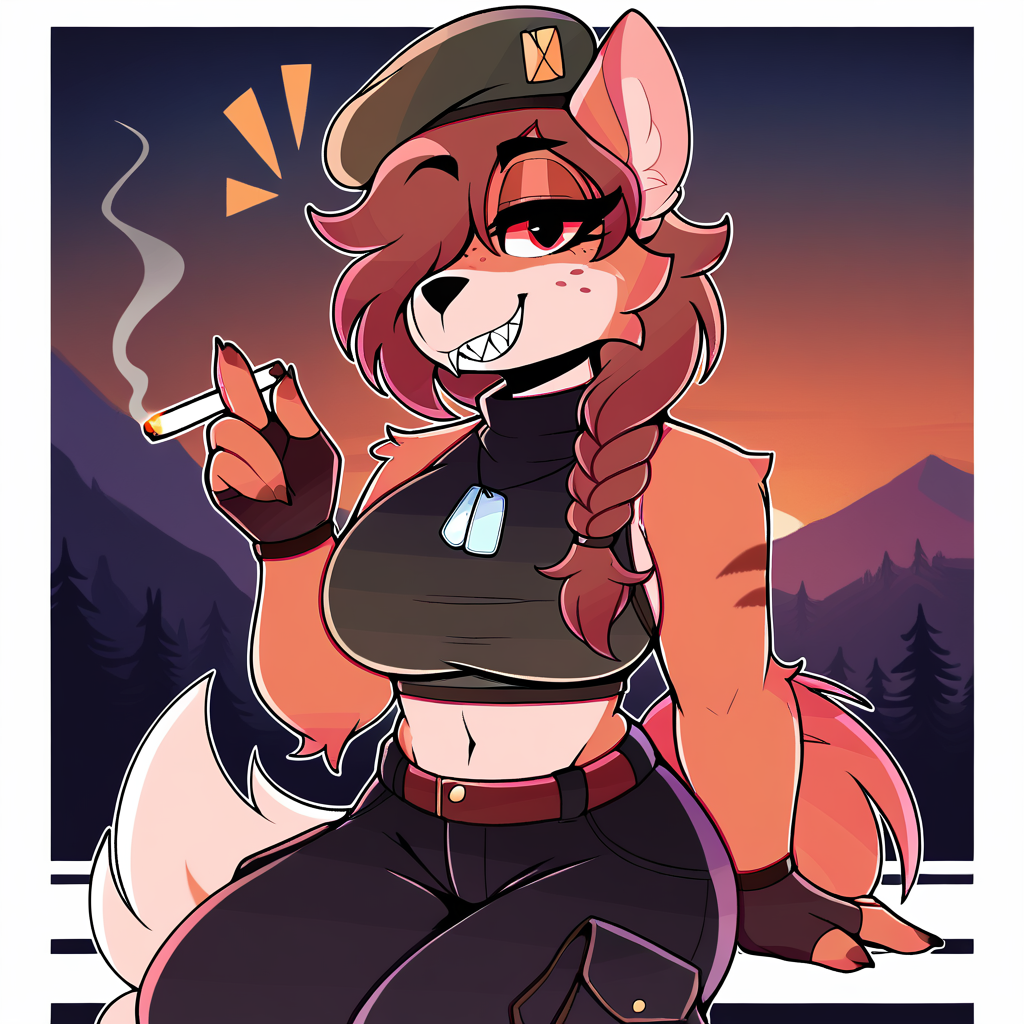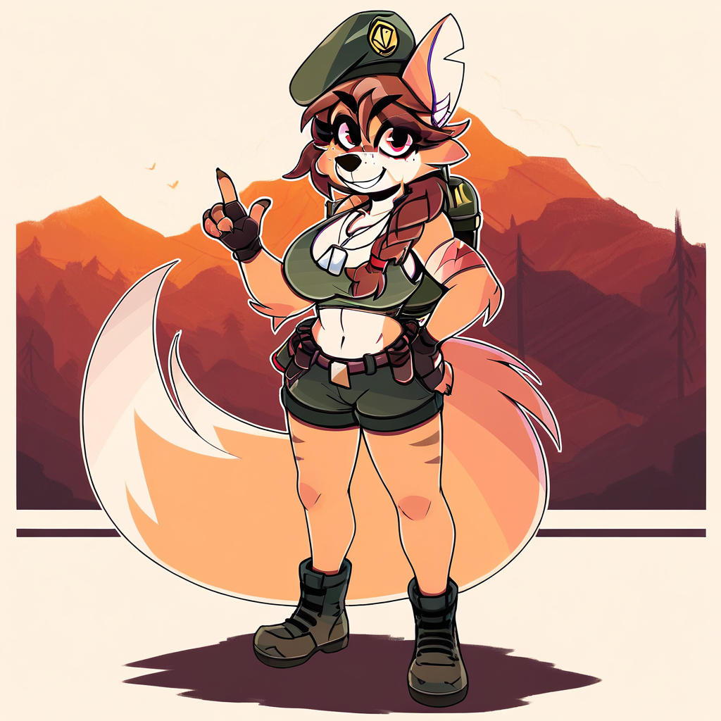 Trigger words: ember, fox, red eyes, brown hair, orange fur, tail, headwear, headgear, beret, large breasts, hair over eye, braided hair, braid, dog tags, freckles, midriff, green tank top, green cargo shorts, military boots, fingerless gloves, sharp teeth,
