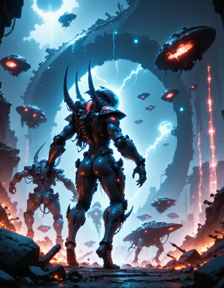 lightning stormを追加すると、ほとんどの場所で空に雲と雷が追加されるcyber portal in [other location]という表記を使用すると、1つ以上の光る円形ポータルを追加できるfloating war machinesを追加すると、通常いくつかの飛行メカノイド艦船が追加される
