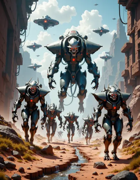 メカノイドとその生存に必要な機械の製造を支えるために、巨大な工場都市が建設されている。これらの塔は、輝く金属とガラスでできた住居から、溶けた金属が流れ続ける地獄のような工場まで多様である。都市の下では、毒性の高い汚水が地面の深い井戸へと流れ込んでいる。