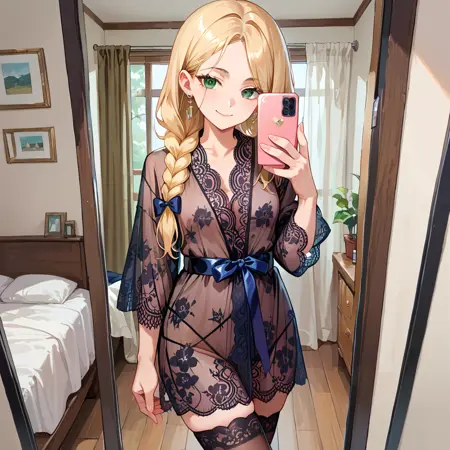 触发词:花卉网纱长袍、长袖、透明、缎面蝴蝶结腰带