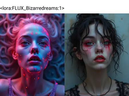 bizarredreams 是必需的触发词。你可以在 LoRA 中查看其他触发词,如何根据此 LoRA 的能力创作图像,取决于你的想象力。