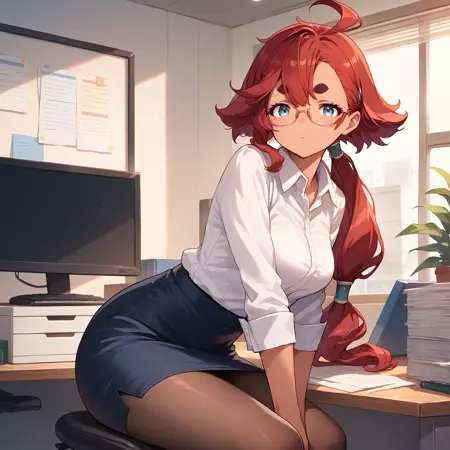 Asticassia school uniform : suletta mercury, asticassia school uniform, dark skin, red hair, long hair, low ponytail, black hairband, ahoge, blue eyes, thick eyebrows, white jacket, long sleeves, yellow necktie, shoulder boards, white shorts,