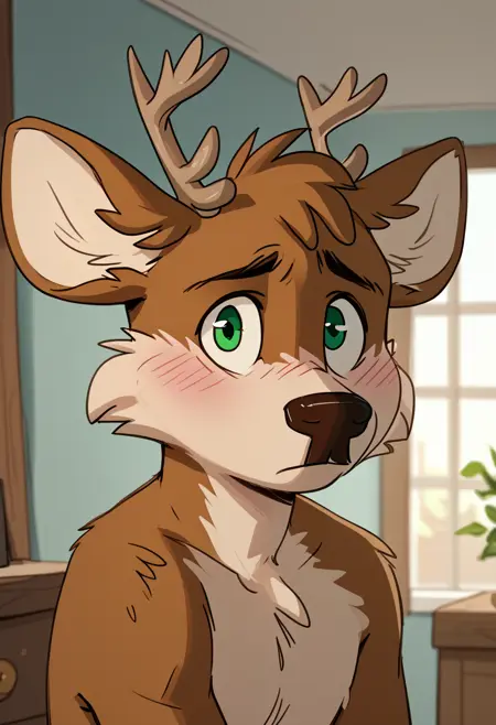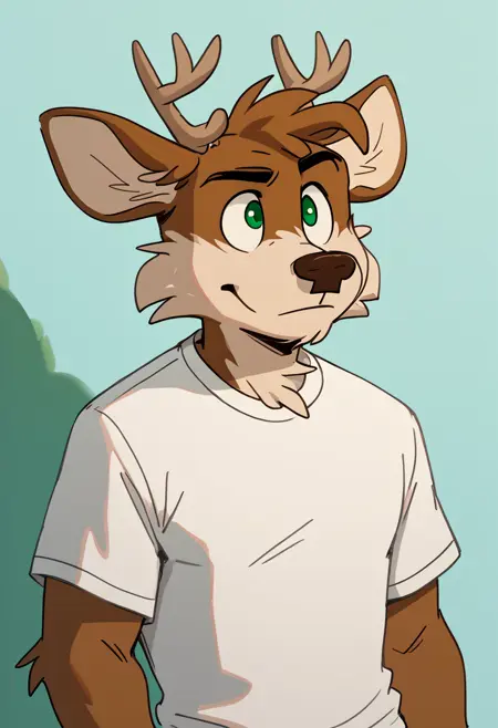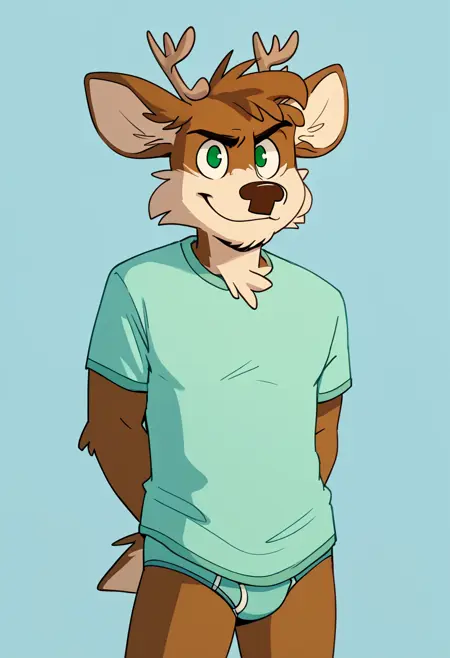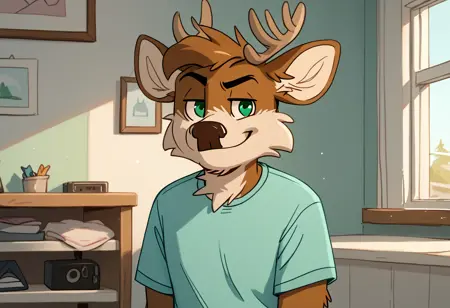 Pony: score_9, score_8_up, score_7_up, score_6_up, score_5_up, score_4_up, tinydeerguy, d4rw1n, 1boy, solo, furry, furry male, antlers, pants, green shirt, tag1, tag2
