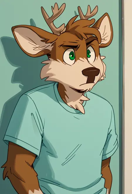 Illustrious: best quality, amazing quality, very aesthetic, absurdres, newest, tinydeerguy, d4rw1n, 1boy, solo, furry, furry male, antlers, pants, green shirt