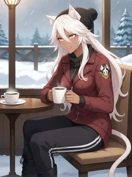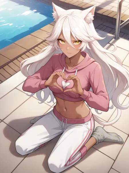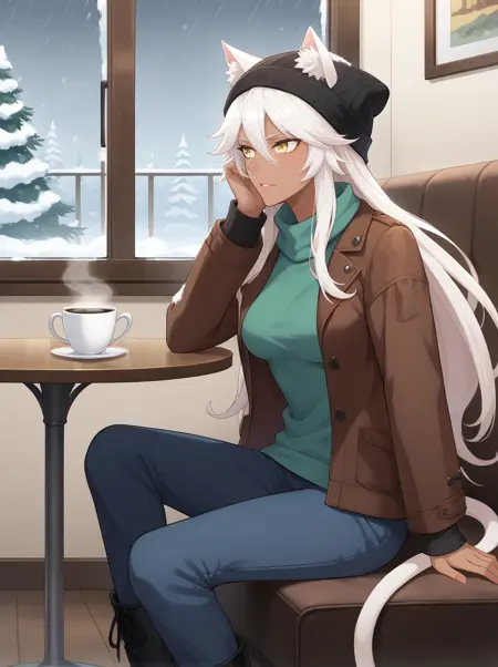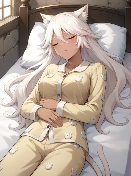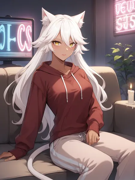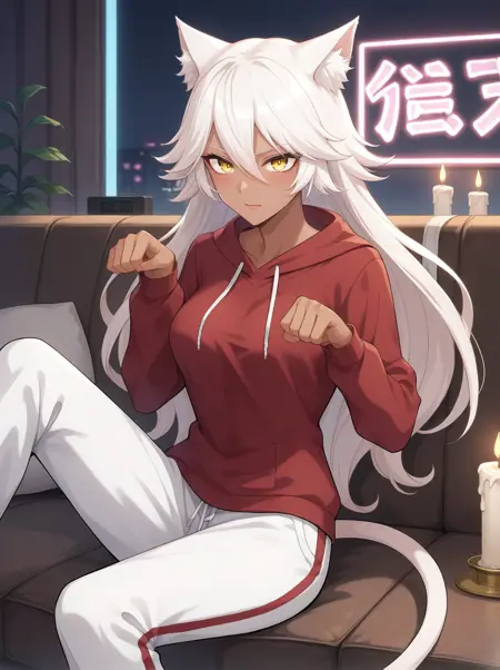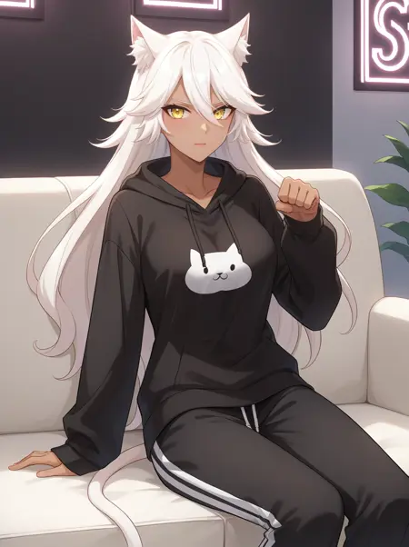 外观:动物耳朵、白发、长发、深色皮肤女性、黄眼睛、白色猫尾