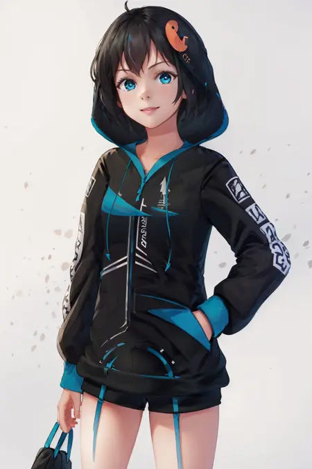 默认服装: 帽子拉起,黑色夹克,连帽外套,黑色短裤,及膝袜
