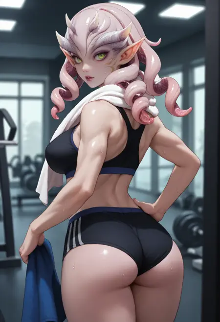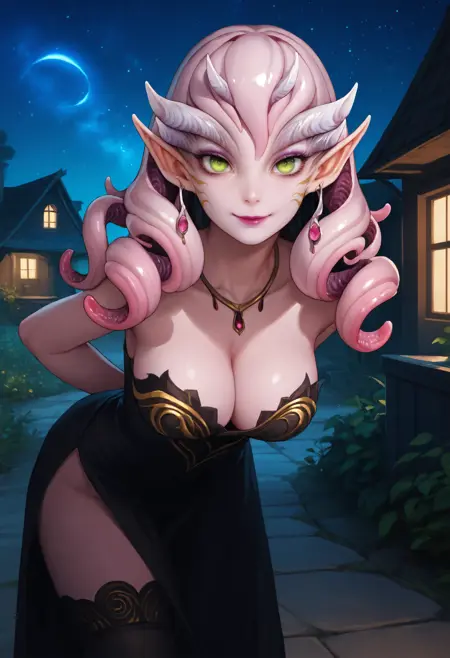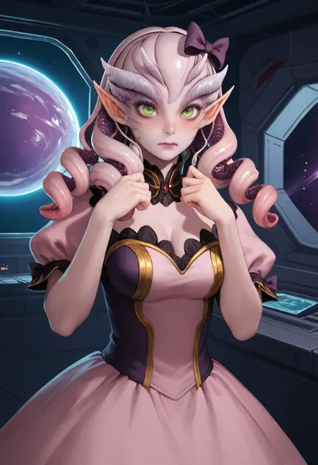 常に必要: "celessub, alien, pink skin, green eyes, eyelashes, pointy ears, lipstick, makeup, eyeshadow, pink hair, tentacle hair, drill hair, long hair, large breasts"