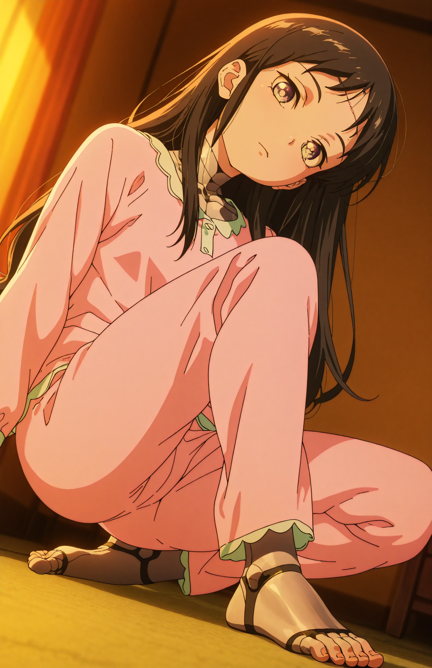 mina, long hair, dark dress, necklace, dark brown pantyhose