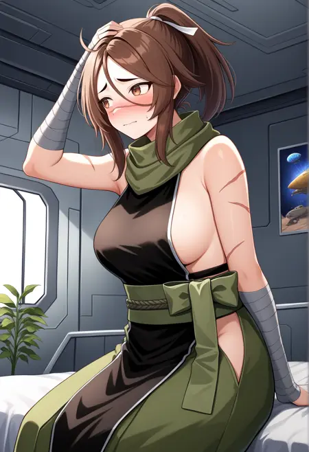 Asc3:中长发,棕色头发,棕色眼睛,脸上有疤痕,多处疤痕,马尾,绿色围巾,无袖连衣裙,侧开式服装,腰带,袴,侧边开衩,手臂缠绷带