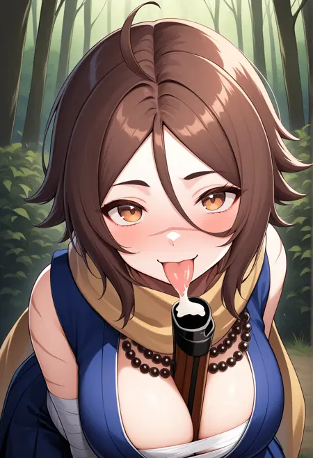 Asc2:短发,棕色头发,棕色眼睛,脸上有疤痕,多处疤痕,珠串项链,黄色围巾,和服,腰带,无袖,手臂缠绷带