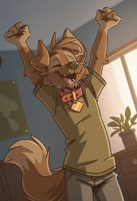 Illustrious: best quality, amazing quality, very aesthetic, absurdres, newest, tinydeerguy, matt_riskely, 1boy, solo, furry, furry male, grey pants, green shirt