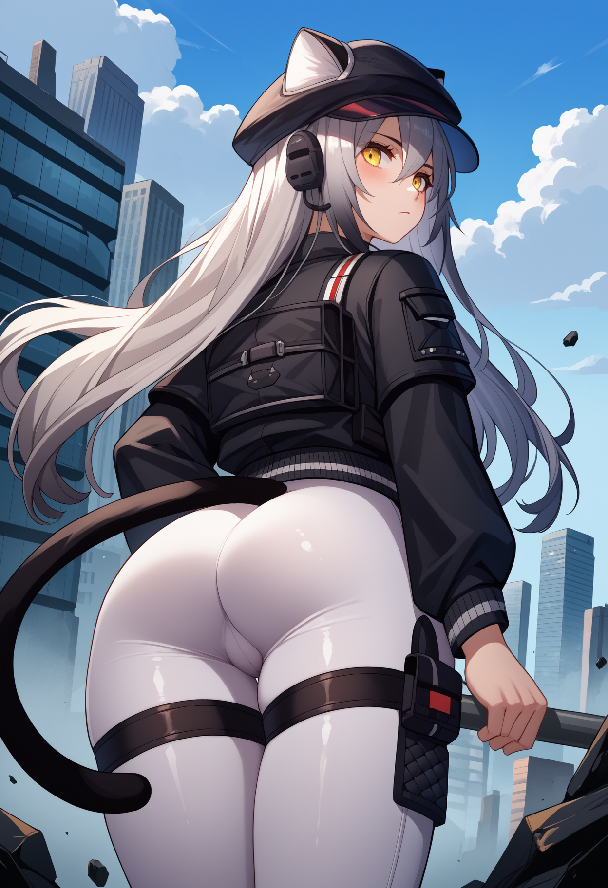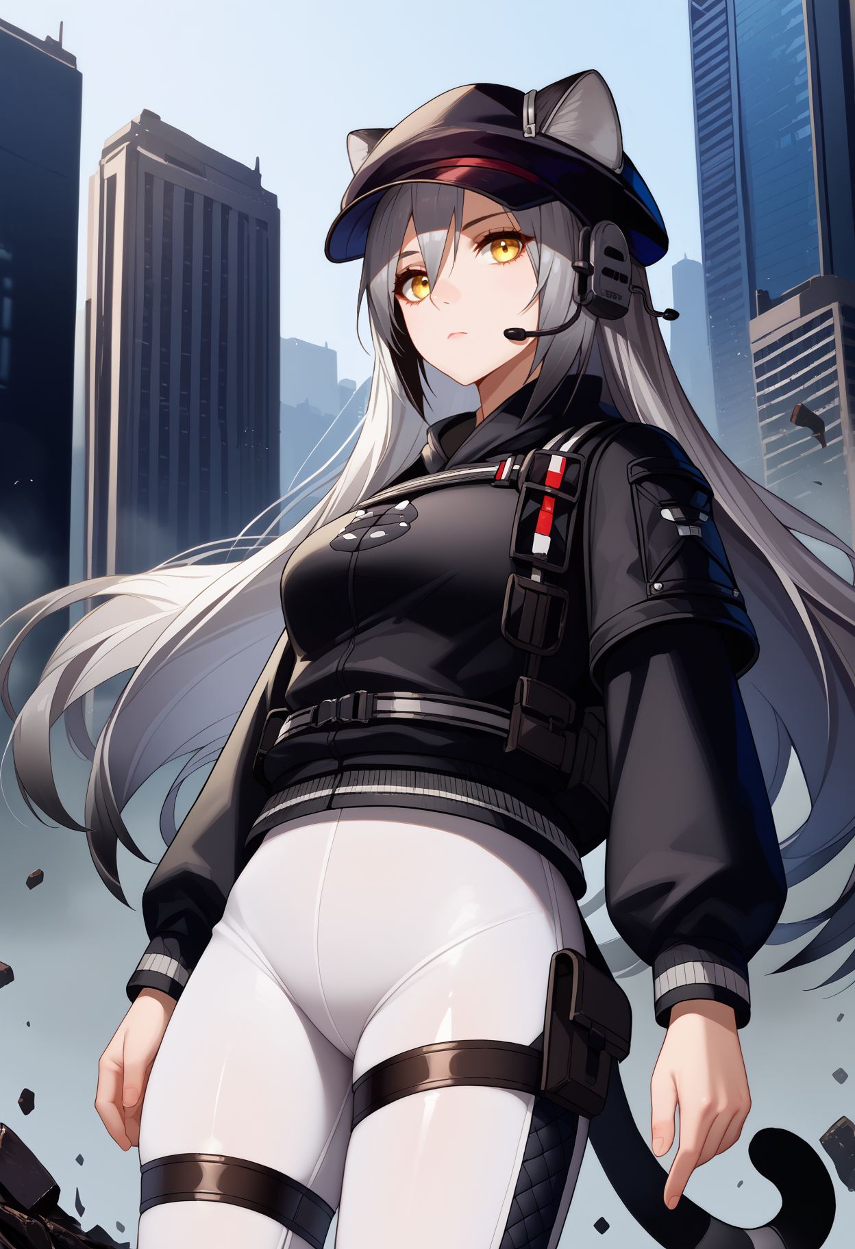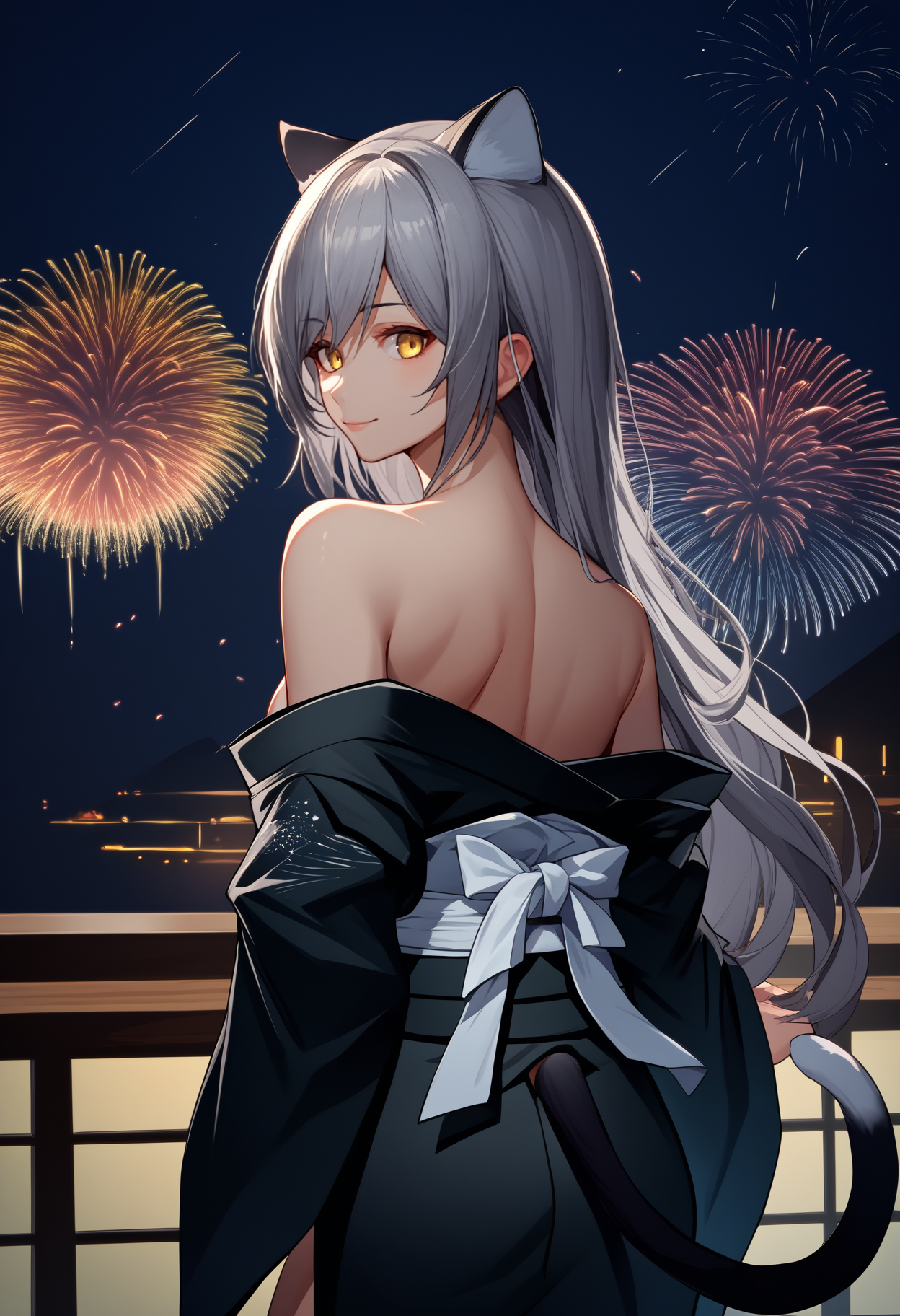 トリガー+外見: shwrzsky, 猫の尾, グレーの髪, 動物の耳, 黄色い目