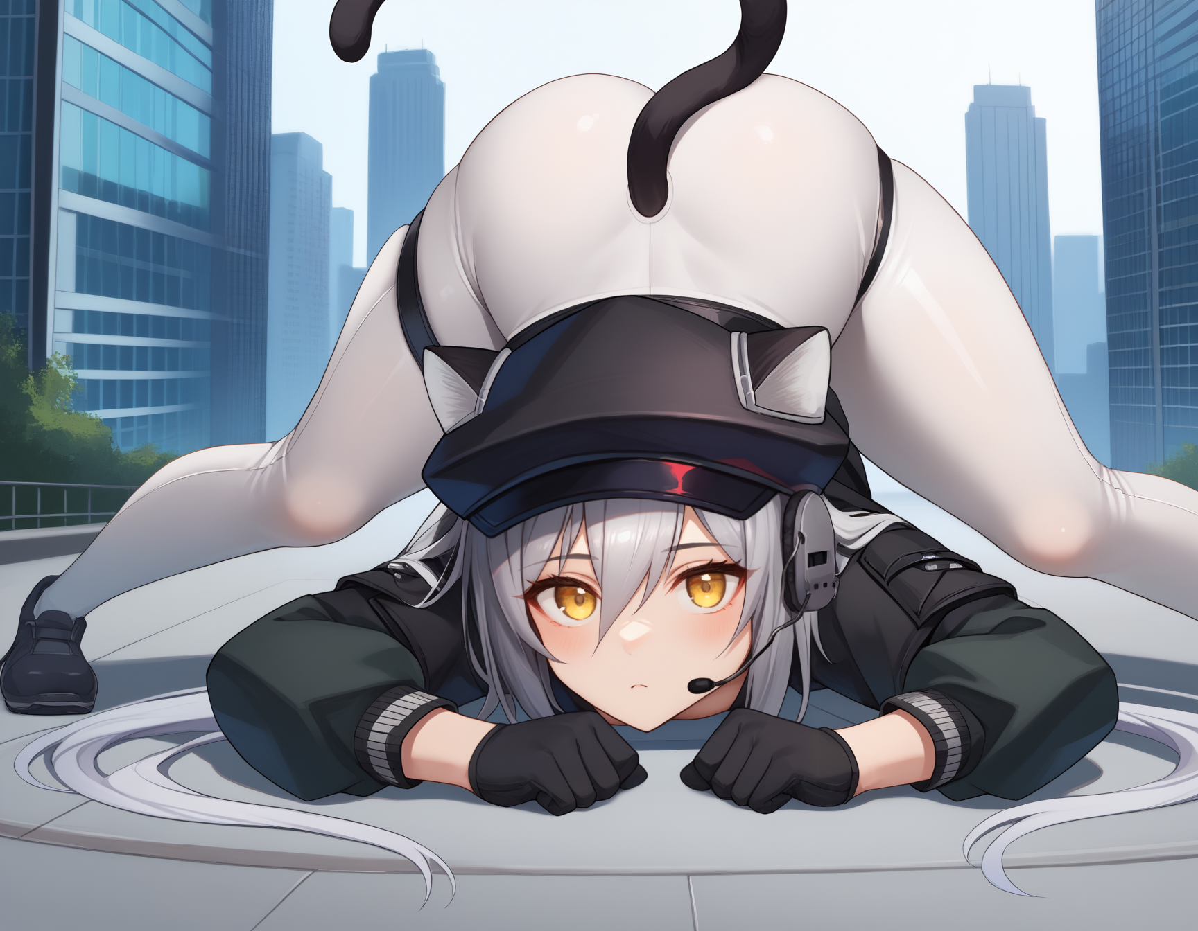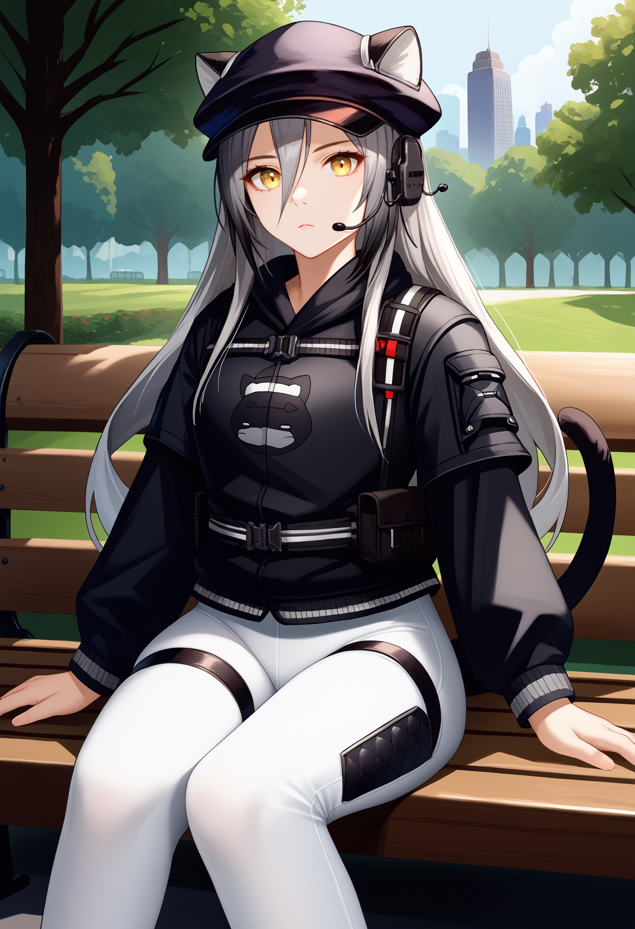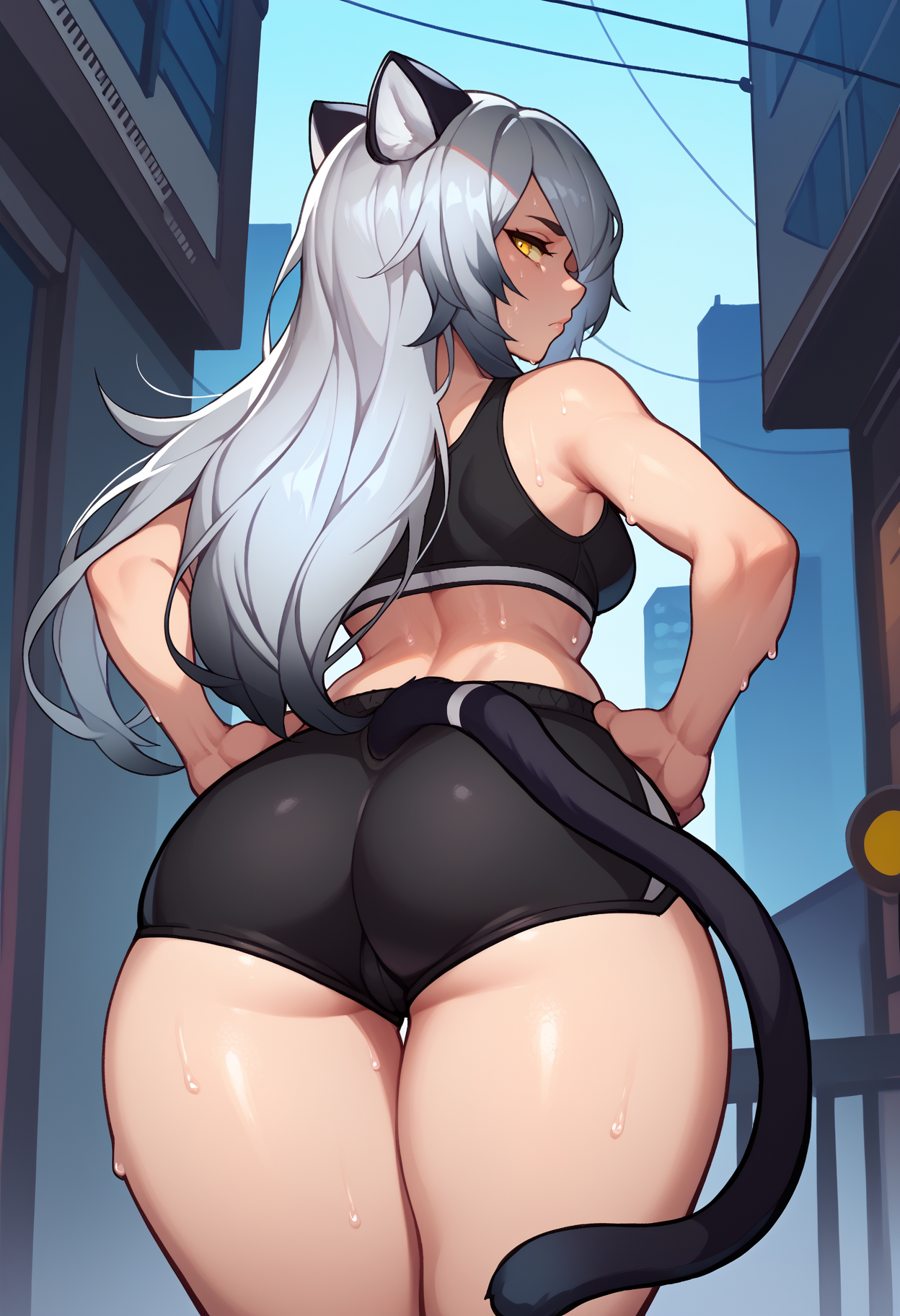トリガー+外見: shwrzsky, 猫の尾, グレーの髪, 動物の耳, 黄色い目