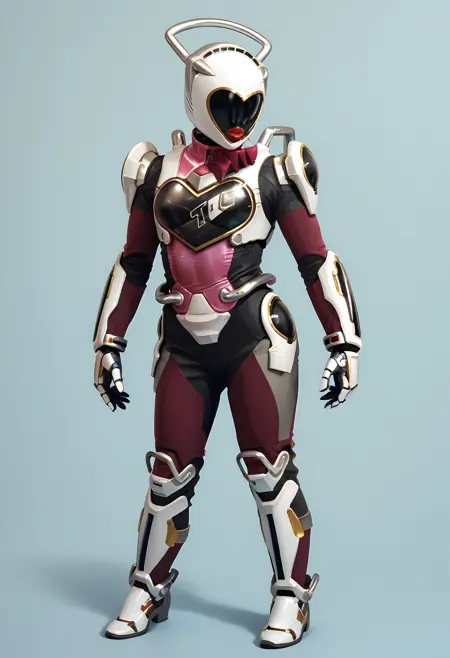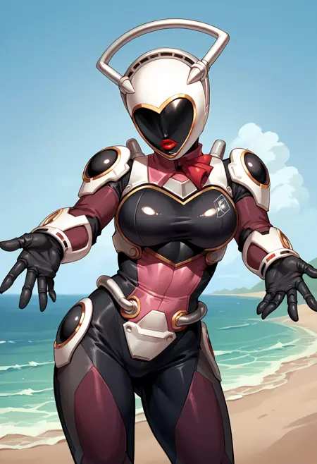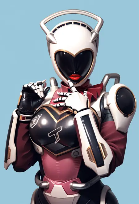 1girl, 헬멧, 로봇, 인간형 로봇, 바디수트, 갑옷, 립스틱, 붉은 입술, 장갑, 메이크업, 가슴, 엉덩이, 부츠