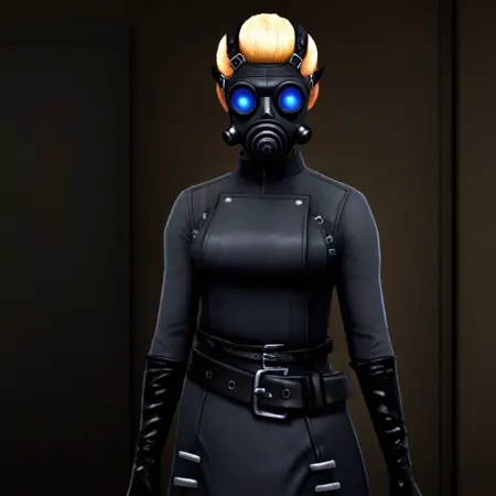 防毒面具,蓝色镜片,外套,裙子,腰带,肘部手套,长裤,护膝,靴子