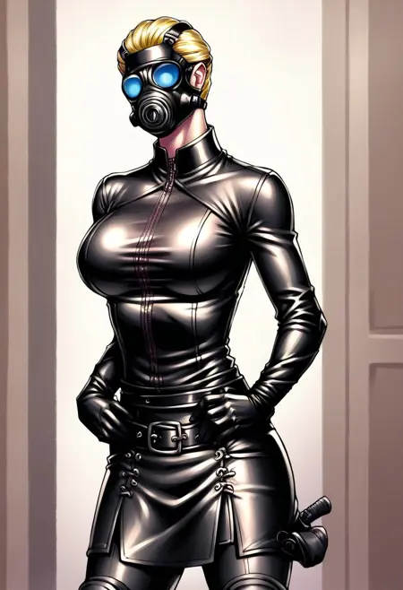 gas mask, blue lenses, Coat, skirt, belt, elbow gloves, pants, knee pads, boots