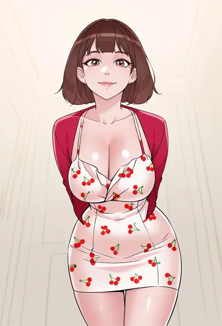 4. ((sexy sleeveless white dress with red cherry print, obscene cleavage, huge cleavage, pink jacket, )) + black long-strap handbag,