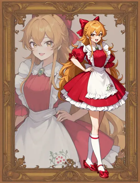 hair bow, red dress, brooch, apron, white socks, red shoes