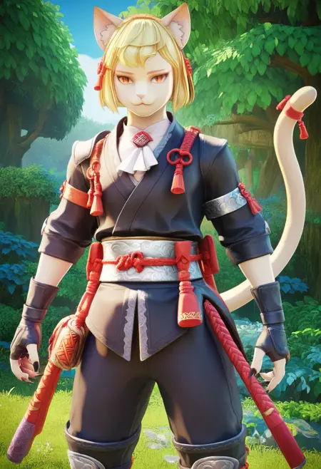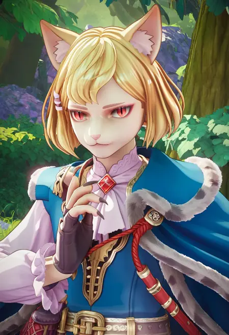 vom morley, blonde hair, red eyes, black pupils, slit pupils, gloves, furry, furry male, cat tail, animal ear fluff, cat boy, cat ears, tail ornament,
