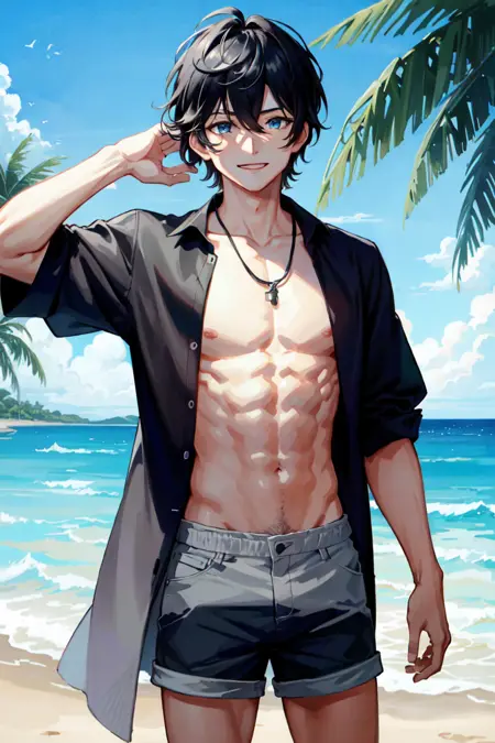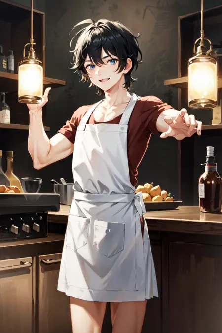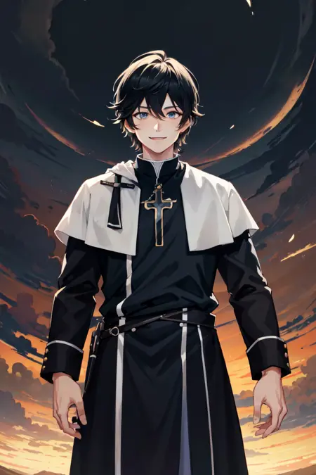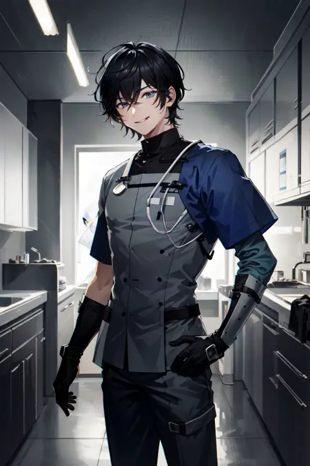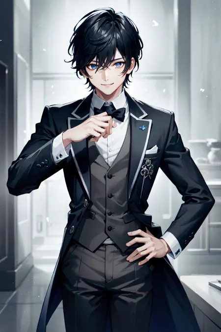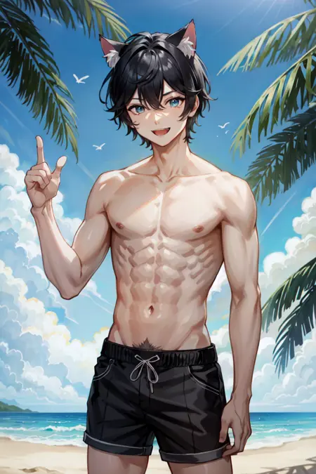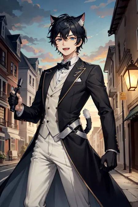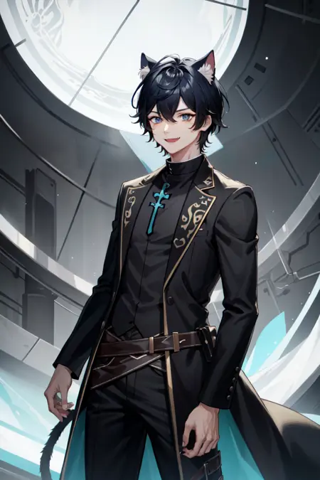 AxiaKrone, 파란 눈, 검은 머리, 짧은 머리, 고양이 귀, 고양이 꼬리, 송곳니, 검은 손톱, 백옥 같은 피부, 고양이 소년